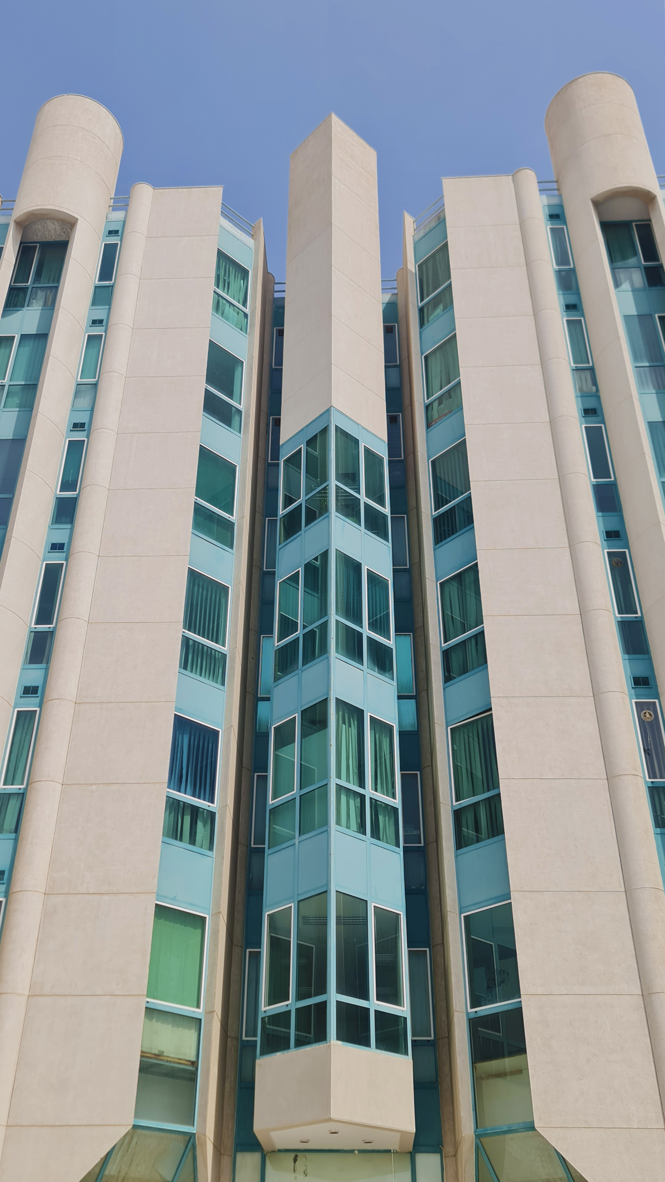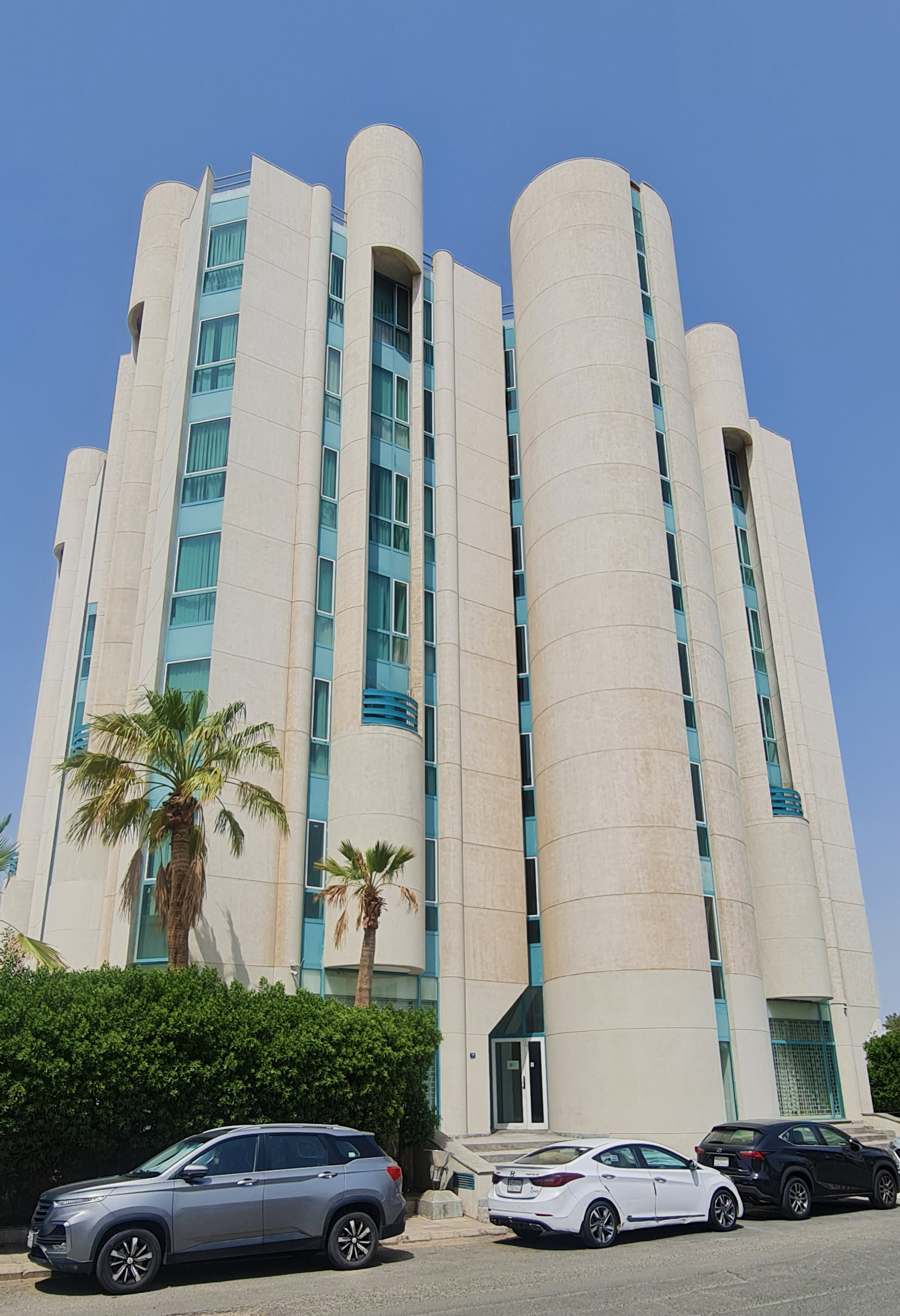 The Rajab & Silsilah office building was finished in 1980, and it is an expression of the construction material, mainly composed of reinforced concrete cylindrical volumes that rise up from the narrow site. This constrained location, amongst mostly low-rise residential and local retail outlets, has probably dictated the congested massing of predominantly monolithic vertical volumes that appear to have been bundled into an office building. Openings and windows have been kept to a minimum and are always deeply embedded between the volumes’ cavities and resultant spaces. This has probably minimised the impact of direct and often glaring sunlight into the office spaces, while at the same time, has given the white-washed concrete volumes their sculptural appearance. One cannot but help notice how the architecture would have been an appropriate nod to the efforts by the Architect Mayor of the time; Mohammad Said Farsi, to introduce sculpture and art to the public realm in the ever-expanding city of Jeddah.