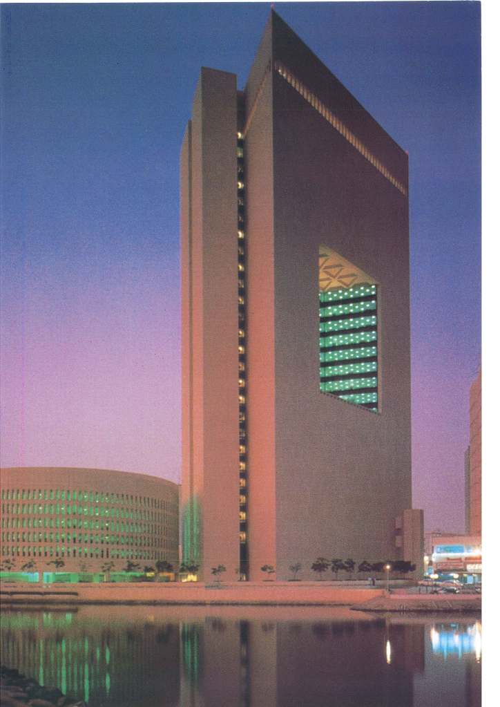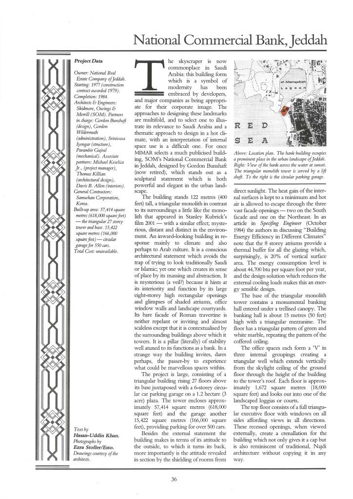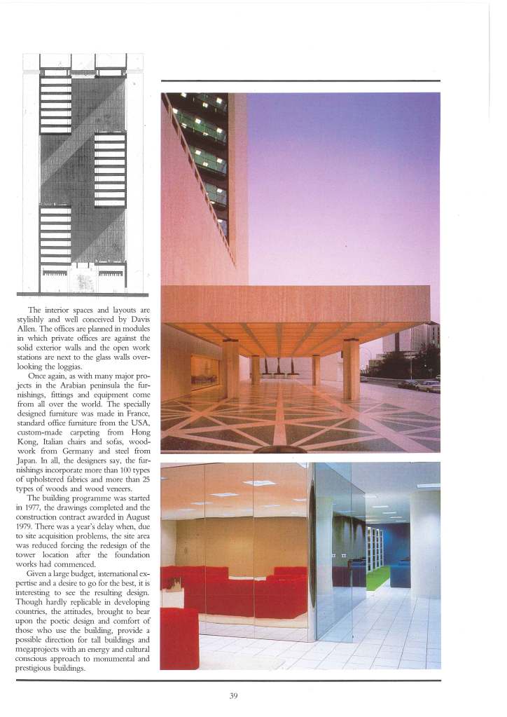 Continuing our archives series, posting articles on projects in Jeddah by international architects and firms. This article on the NCB Tower by SOM was featured in MIMAR issue 16, published in April-June 1985. The building programme for the NCB tower commenced in 1977, with the drawings completed and the construction contract awarded in August 1979. There was a year’s delay when, due to site acquisition problems, the site area was reduced, forcing the redesign of the tower location after the foundation works had commenced. It is worth noting that the interior design for this one-of-a-kind office building was conceived and developed by then SOM partner, Davis Allen. Allen had joined SOM in 1950. He became a partner in 1965 and remained at SOM until his retirement in 1990.