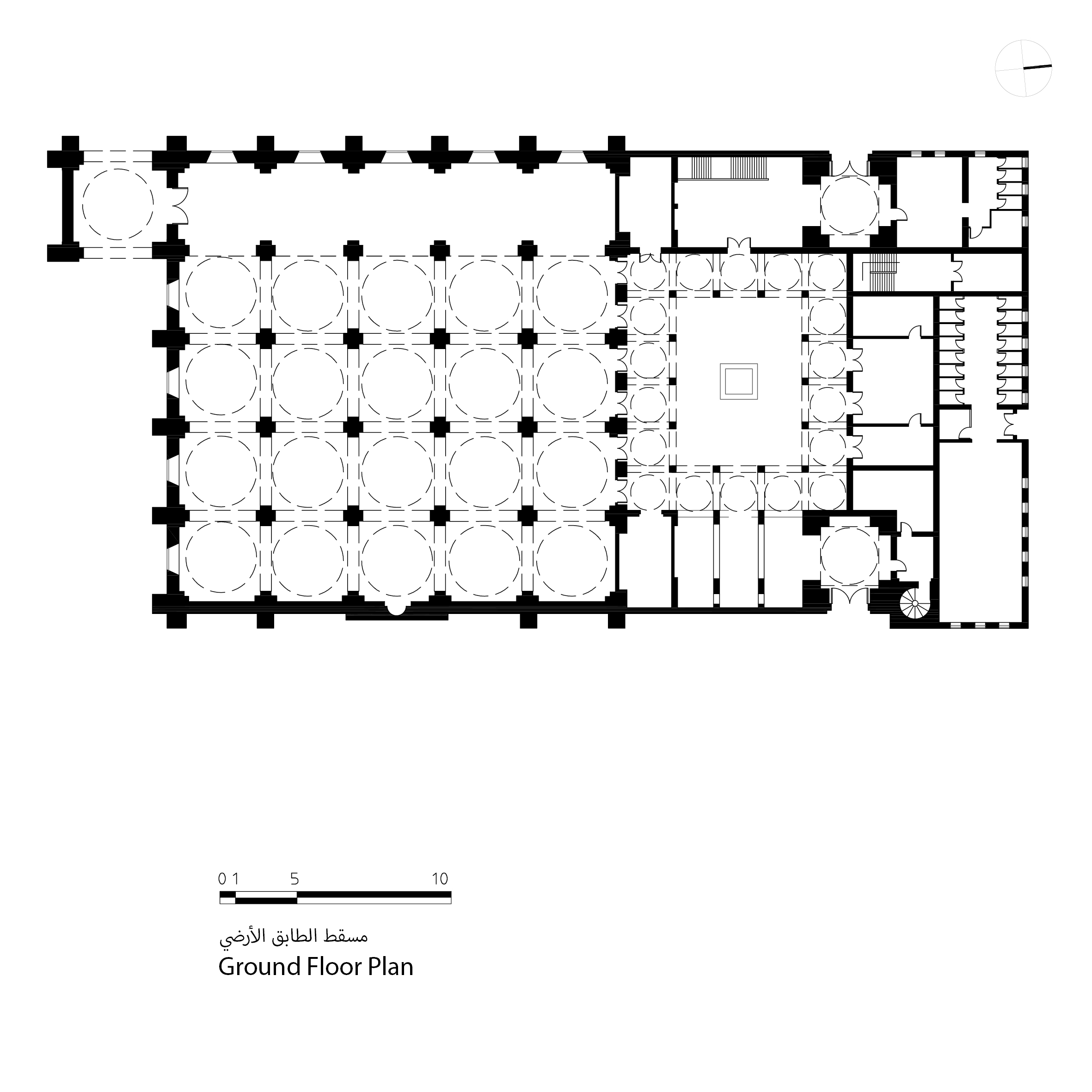 أما قاعة الصلاة الرئيسية (أروقة المسجد الخمسة والعشرين) فهي مربعة الشكل ومكونة من شبكة أروقة (5 * 5) مغطاة بقباب مرتكزة على عقود الزوايا*، يبلغ قطر كل واحدة منها حوالي 6 أمتار.