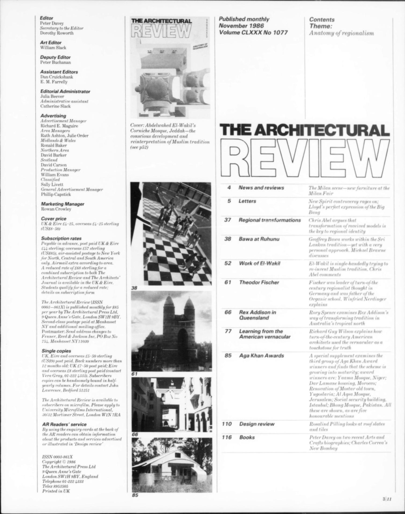 The November 1986 issue of Architectural Review features an in-depth exploration of the work of El-Wakil, the acclaimed Egyptian architect known for his innovative designs that blend tradition with modernity. This edition includes detailed plans, cross-sections, and stunning images that highlight his unique architectural style and mastery of space, illustrating how his creations reflect the cultural heritage of Egypt while embracing contemporary design principles.